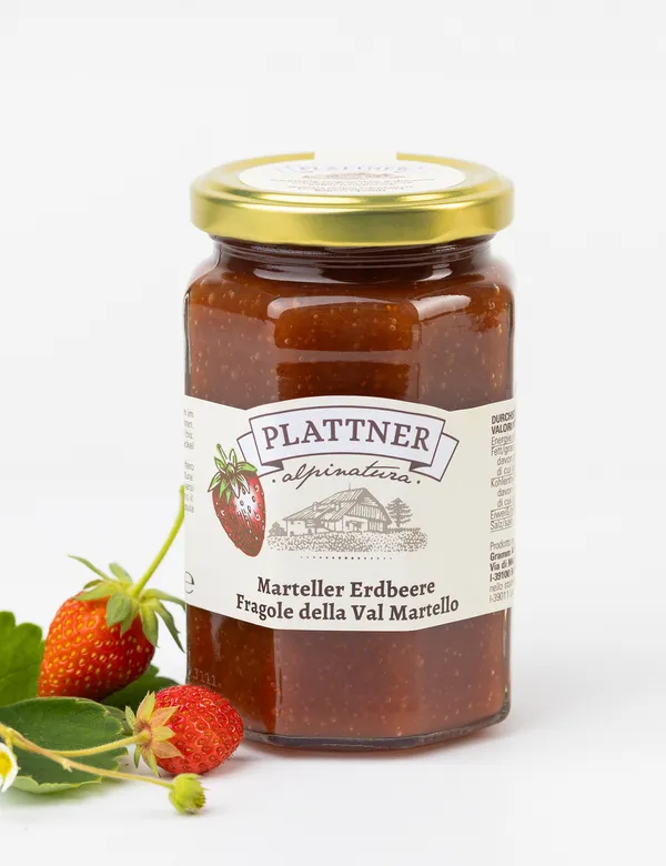 Diese fruchtige Konfitüre wird aus der berühmten Marteller Erdbeere hergestellt, die im Martelltal in Südtirol gedeiht.