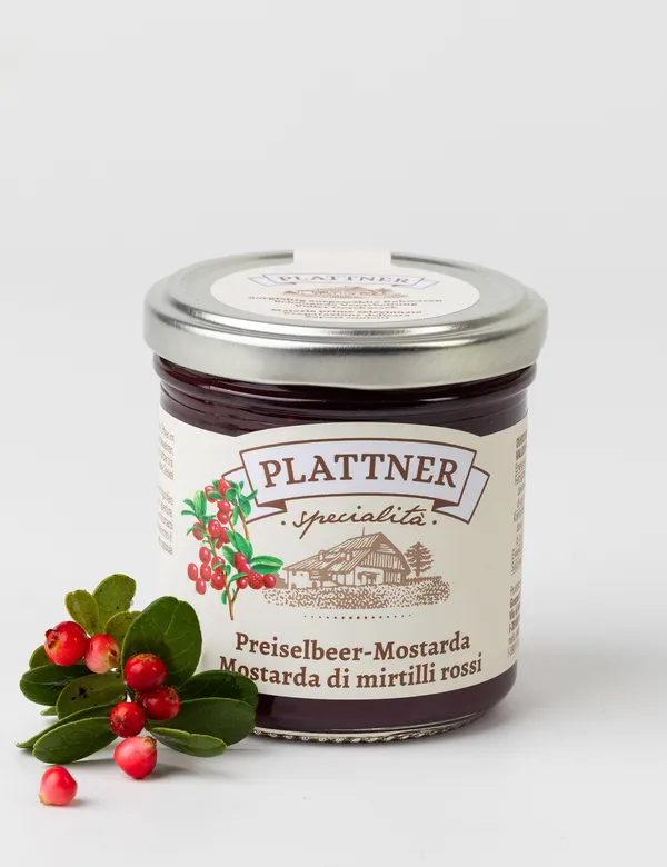 Diese Mostarda vereint die herbe Süße der Preiselbeeren mit der scharfen Note von Ingwer und Peperoncino.