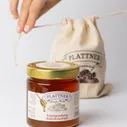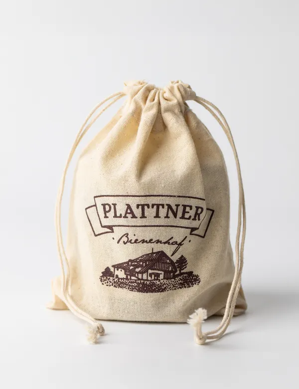 Großer Baumwollbeutel mit praktischem Ziehverschluss – ideal zum stilvollen Verpacken von Honiggläsern 500g oder kleine Geschenken. Wiederverwendbar, nachhaltig und charmant.
