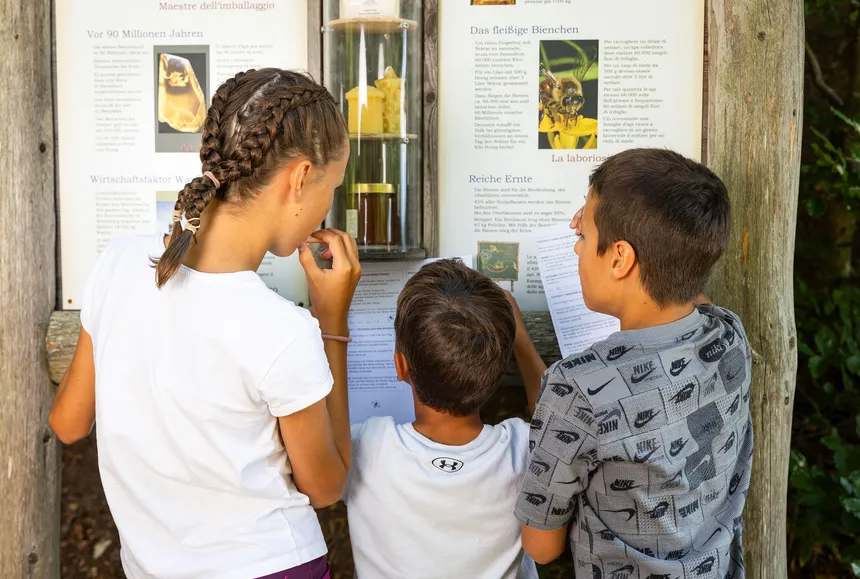 Wie sieht die Biene? Kann die Biene eigentlich hören? Inmitten von Blumenwiesen führt dich unser Lehrpfad durch neun Stationen, die alle deine Sinne mitnehmen in die Welt der Honigbiene.