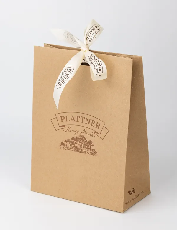 Elegant gift bag made of high-quality paper, adorned with a satin ribbon bow – perfect for stylishly presenting special gifts.